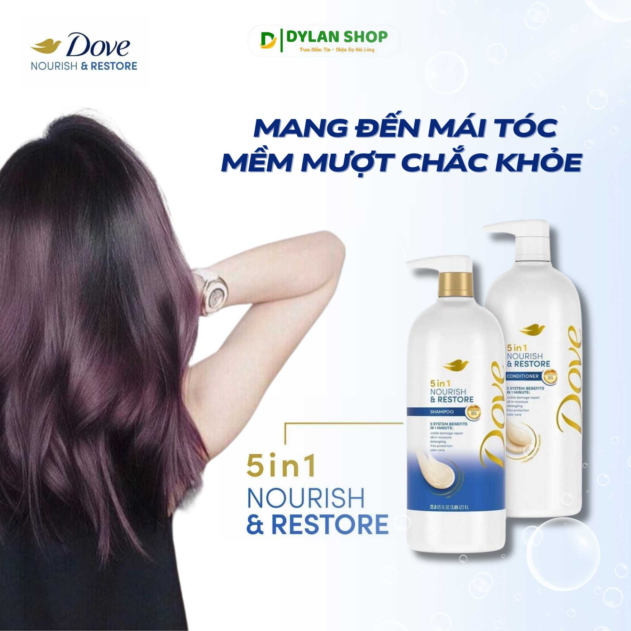 Dove Nourish & Restore 5-in-1 Shampoo với phức hợp Protein Repair + vitamin B5, dịch vụ chăm sóc tiên tiến 5 trong 1 giúp nuôi dưỡng tóc khô và hư tổn.