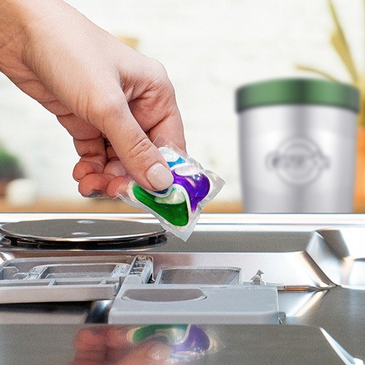 Bước 1: Đặt 1 viên nén vào ngăn chứa của máy rửa chén.